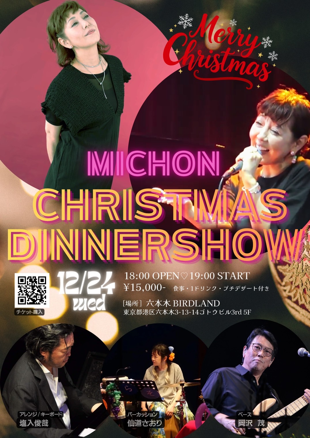 | 18:00open 1st 19:00〜20:10 2nd 21:00〜22:10 M.C. 4,400円 T.C.550円(税込/サービス料10%別) ※ご予約の方はTC無料 |